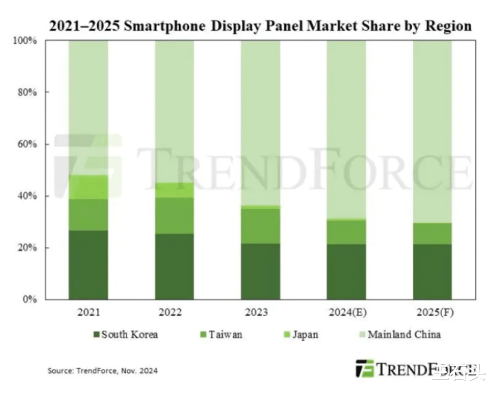 如今,中国大陆面板厂已经掌握全球约70%的LCD产能,其中TCL和京东方两家共同占据了全球近半市场份额,2024年中国大陆厂商也追平了韩国面板厂商AMOLED智能手机面板出货份额。