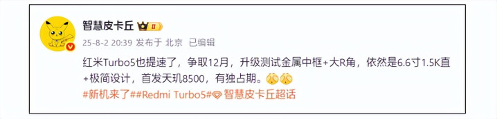 再说一嘴“REDMI Turbo5”的续航和外观到底怎么样!从科技网站曝光的消息完全可以得出一个很明确的参数,就是7000毫安的电池“我讲个实话,大多数博主直接会表示很惊讶”但是于我而言,这就是本以堆料为前提的一种进步,而这种进步肯定是为了广泛用户的体验为导火索,所以说对红米的7000毫安电池,我只用一句话来总结就是“看似堆料,本为堆料,但是供应链的降维打击,更是一种对用户需求的满足”