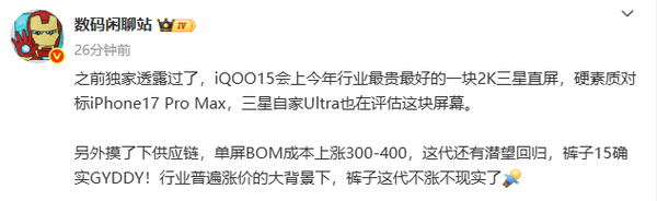 据其消息,iQOO15将采用一块2025年行业内素质最高、成本最贵的2K分辨率三星定制直屏。该屏幕在显示硬素质方面已达到顶尖水准,直接对标已经发布的iPhone17ProMax所用屏幕,甚至三星自家的GalaxyS26Ultra也在评估是否采用同款面板,足见其技术领先性。