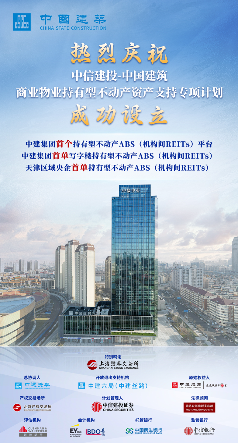 本次发行由集团财务资金部统筹,中建资本、中建六局(中建丝路)联合实施,以中建地产(天津)有限公司所属中建中心写字楼物业为标的资产,最终按询价区间上限溢价完成发行。该产品成功搭建集团首个机构间REITs平台,成为存量资产盘活与金融资本运作的重要实践,形成了标准化方案和模式,未来将持续盘活更多存量资产,促进平台长期战略价值提升,为集团高质量发展注入新动能。